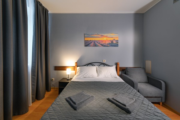 Один из самых популярных типов номеров для отдыха на море в Краснодарском крае. Здесь можно останавливаться надолго и чувствовать себя, как дома. Одна из комнат – это спальня с двумя односпальными или одной двуспальной кроватью. Вторая – кухня-гостиная. Есть также санузел и балкон.